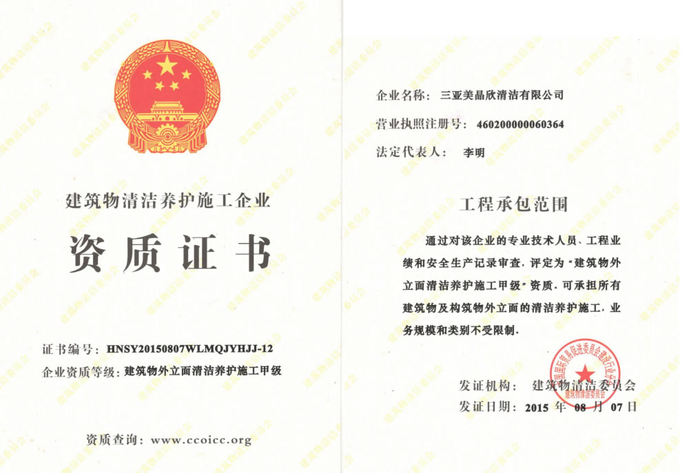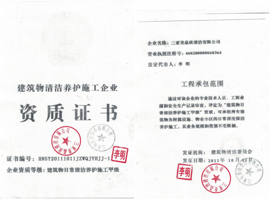 三亚美晶欣清洁有限公司是三亚清洁行业协会会长单位。荣获石材清洁护理施工甲级资质、建筑物日常清洁养护甲级资质、中国石材协会会员。凭着自强不息的奋斗和与国际专业机构的合作。迅速地成为三亚市清洁市场上具有特色、实力、专业、和一定影响力的企业。 公司是海南省第九届世界芒果节唯一指定专业保洁公司。